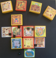 Each room has different doors and objects that come into play during the game, and players must search the items in the room to find the treasure hidden within. The electronic voice version replaces the modular board (the cardboard tiles) for a fixed layout reminiscent of Cluedo (Clue for Americans). In this version, the electronic device will tell the players which items are in the room, so the setup to the house isn’t the same each time. Other than the board and the mechanical voice, everything else remains the same from the original Mystery Mansion.