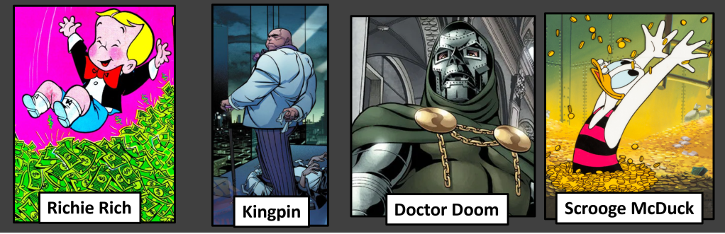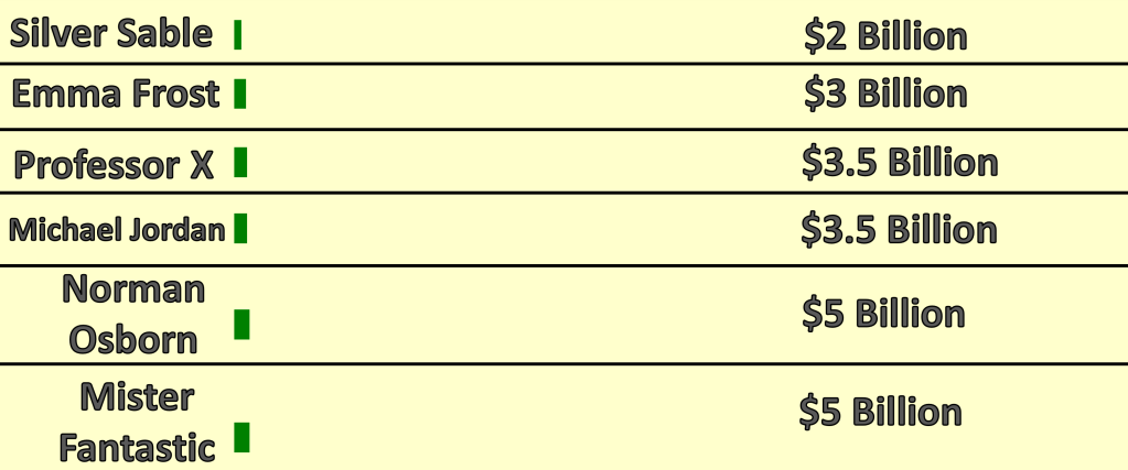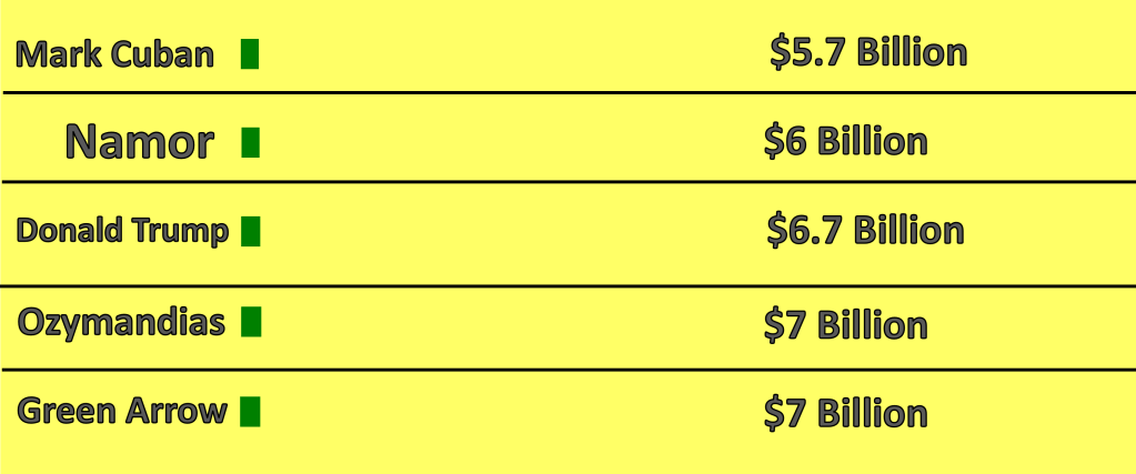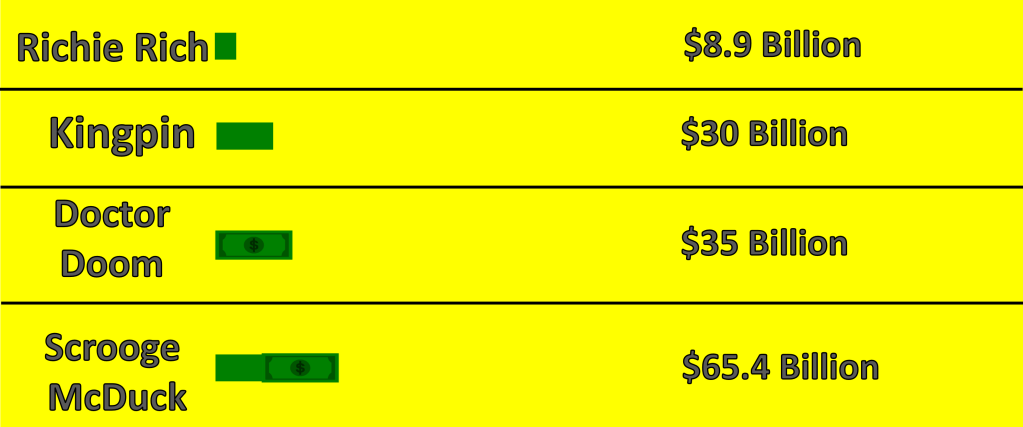 The following statistics for comic book character wealth comes from Wealthy Gorilla, while the wealth of real world people comes from Forbes. These statistics were retrieved on January 13, 2025; they are subject to change.