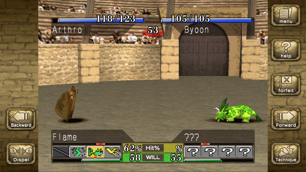 Each technique also has a hit percentage, which will tell the player how likely that technique is to hit the opponent. Flame has a 62% chance to hit my opponent here and costs 21 Will. Also, what Byoon is doing in this picture is called “Foolery” (not listening to their rancher). This frequently happens when monsters don’t have much loyalty to their rancher.