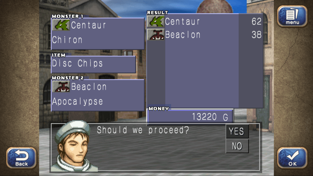 In Monster Rancher 2, once the two monsters are selected, the game will ask if the player wants to use an item as a secret seasoning. Secret seasonings (such as Disc Chips) can offer the player other options for monsters. In this case, even though I used Disc Chips, Dragon isn’t offered as an option. This is because the monsters I chose can’t be combined into a Centaur with a Beaclon as a sub-species and vise-versa. Since they’re not compatible anyway, adding Disc Chips from another monster won’t grant me additional outcomes. They also don’t have many matching stats (the stat levels don’t match per monster).