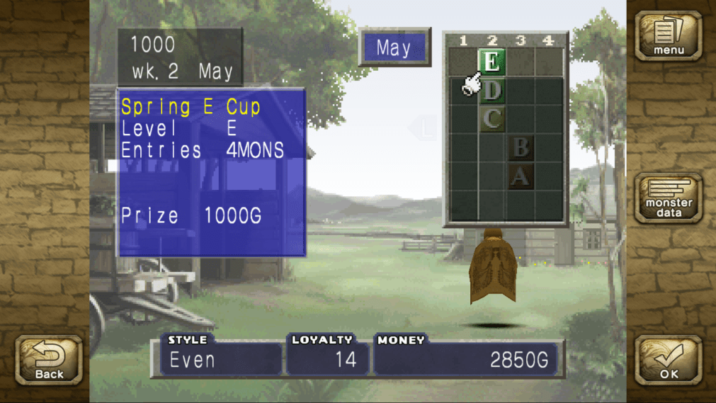 I’ll touch briefly on official tournaments. Monsters can be ranked from E (lowest) to S (highest). Every baby monster starts out at E rank. Official tournaments allow monsters to raise their rank. These tournaments occur at the end of every quarter. They include more opponents but offer less prize money. Official tournaments are essential for monsters to compete at more prestigious tournaments and to unlock more species of monsters. Since Artho is a baby, it’s an E rank.