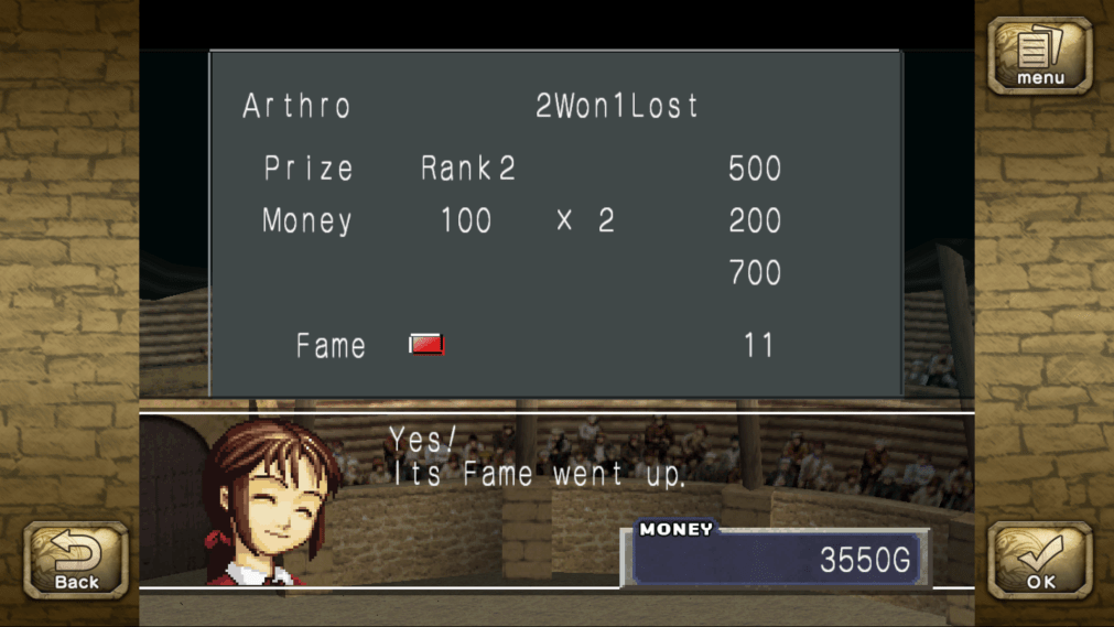 When a tournament ends, prize money is doled out based on the monster’s rank, determined by the monster’s wins. Players also receive bonus money for battles won. Here, I got second place. Notice the monster also has Fame. Fame goes up the higher a monster places in a tournament, which can lead to things as the judges awarding a player’s monster a win during a close battle and increased prize money. In Monster Rancher 2, Fame allows monsters to go on adventures and discover items necessary to unlock new monster species.