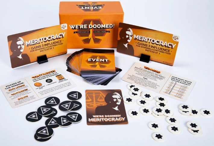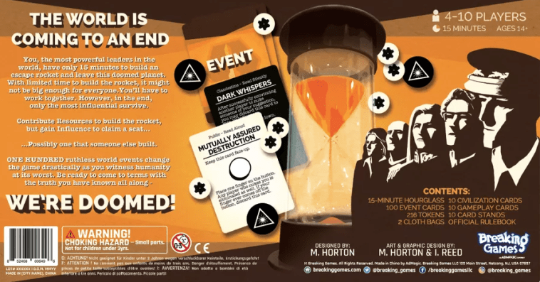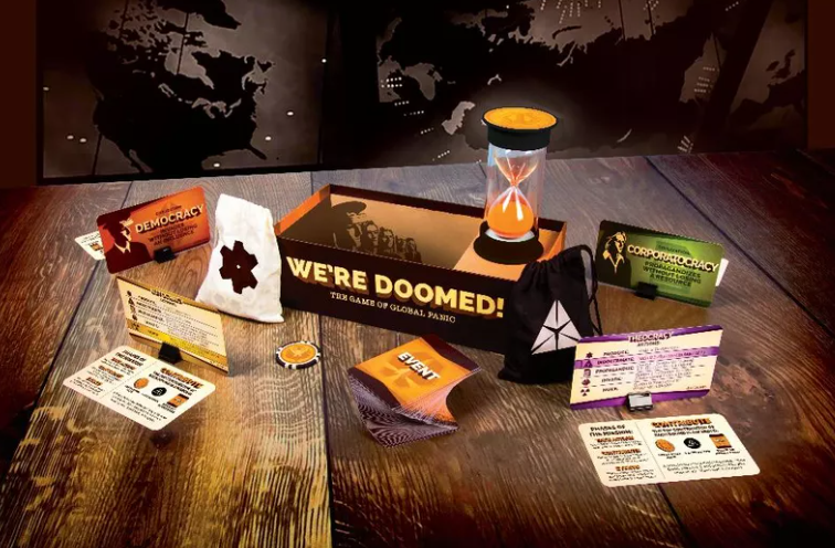 Earth is doomed. The leaders of the world’s most powerful nations have created a scenario where humans need to escape in a rocket ship before the planet implodes. You play the role of one of the world’s leaders. That’s the premise of today’s tabletop game review, We’re Doomed!.