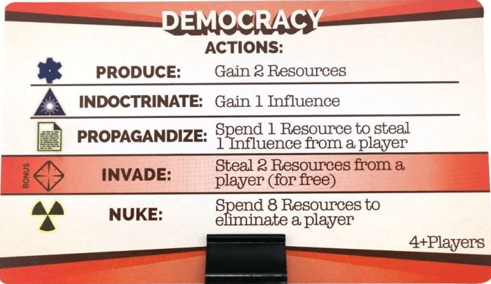 Each nation’s leader has a bonus for one of these five actions. For example, whenever the Democracy “Invades” they steal 2 Resources from another player for free instead of having to spend an influence token. The Theocracy gets a bonus Influence whenever they “Indoctrinate,” and the Technocracy gains an additional resource whenever they “Produce.”