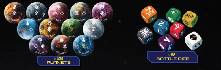 The game lists three ways to win. Far Far Out’s inclusion of 64 battle dice–64!–suggests that one method for victory is military/combat, but Far Far Out insists these battle dice serve multiple purposes. Far Far Out features a lot of exploration. I like that in a game set in outer space. We don’t know too much about the game’s mechanisms, but they have us intrigued.