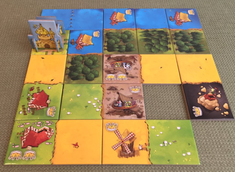 I don’t know how many times I’ve ended up with dead corners (corners that I can’t legally add another domino), but it’s satisfying every time I can put down my full complement of dominoes. Kingdomino is a quick game. The 15-30 minutes printed on the box is accurate. I love Kingdomino’s selection system. Each player has two royal meeples. One will claim the current round’s domino, but the domino you select in the current round will affect when you can select a tile in the next round. Each tile’s backing has a number. Typically, the more valuable tiles have higher numbers, and if you pick a higher value tile, you’ll pick later in the following round. Brilliant!