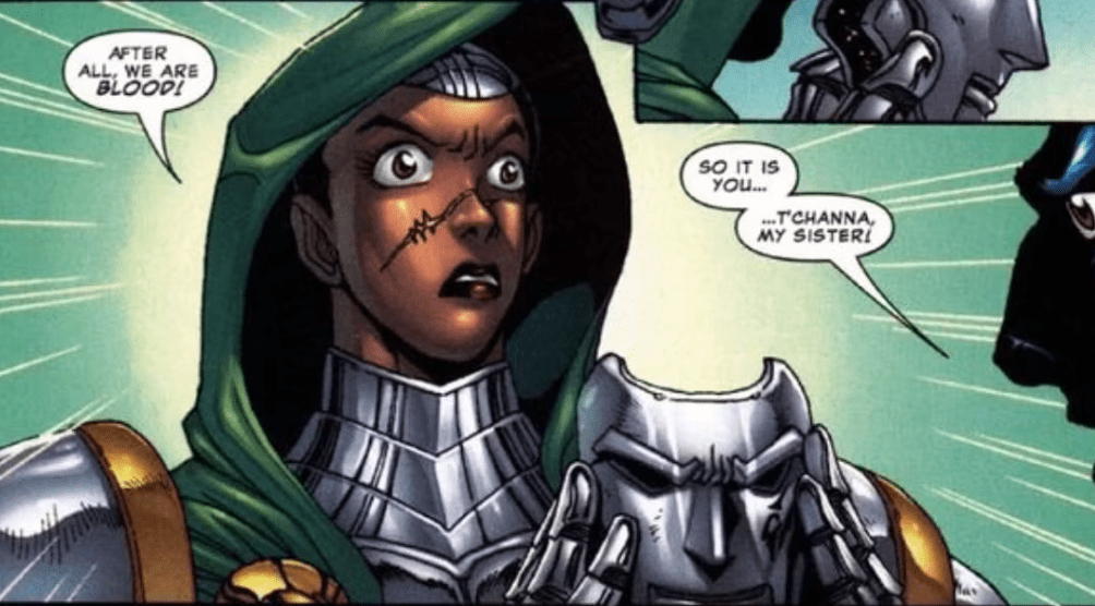 T’Channa is T’Challa’s sister in an alternate universe (Earth-2301). She and her siblings were beaten (she implies brutally) by T’Challa in a contest for Wakanda’s throne. As a result, she left Wakanda for Latveria, where she joined forces with Victor von Doom, until she became strong enough to overtake him as the new Doctor Doom. Honestly, I wouldn’t mind seeing T’Channa’s Doom in an upcoming Marvel project. She blends Wakanda’s technology with the magic she learned from Victor von Doom to become a menace, not just to T’Challa, but to the entire world.