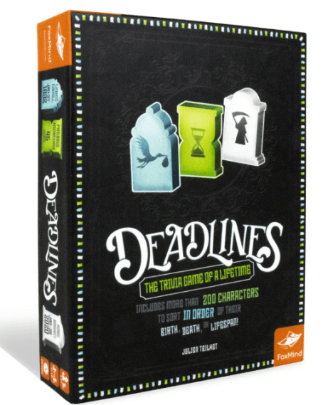 Deadlines is an interesting party game. It includes over 200 cards with famous people. On one side, you get the person’s name (and a quick description of who they were), and then, you must place them in one of three columns: Birth, Death, or Lifespan. You’ll need to place the person on your card in chronological order based on when they were born, when they died, or how long they lived (going shortest to longest). For instance, Napoleon was certainly born before Princess Diana, so you would place Napoleon’s card before Princess Diana’s. Deadlines was a blast. It’s unlike most trivia games, and you can get some fun interactions.