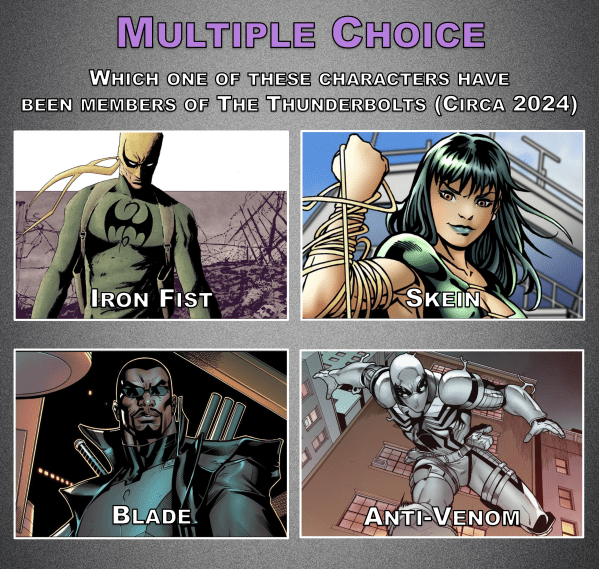 Multiple Choice: Thunderbolts Members Published on December 26, 2025December 24, 2025 by Kyra Share this: Click to share on X (Opens in new window) X Click to share on Facebook (Opens in new window) Facebook Like Loading... Related