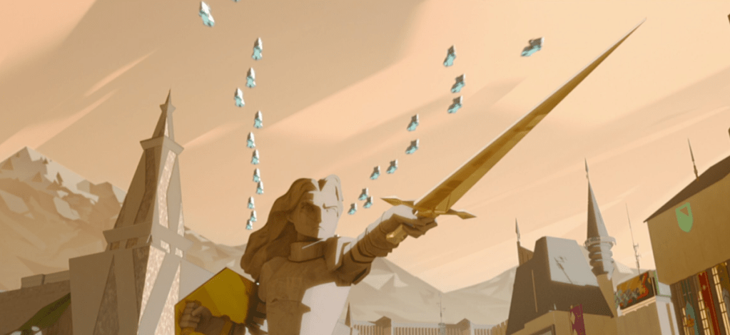 Going back to Nimona’s opening cinematic, after Nimona finishes the storybook introduction, the movie fades to black, and text reads, 1,000 Years Later. Yep. We’ve been here for over a thousand years. That tracks.