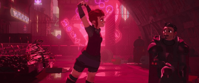 Nimona has plenty of relatable moments. Nestled between a few action sequences, you’ll find two quieter moments: one on the subway train and the other in a shady part of town after Nimona and Ballister kidnap the Squire. The subway train scene is the first time Nimona and Ballister slow down to get to know each other.