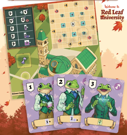 Red Leaf University is a 1–4 player worker placement game where you’ll recruit a team of bright young students and send them to specialized campuses to expand their knowledge, earn academic credits, and chase the ultimate honor: becoming Valedictorian! Red Leaf University delivers a streamlined euro-style experience: with your students, you’ll explore a university divided into six specialized campuses (Art, Business, Science, Architecture, etc.). Each campus allows players to recruit or upgrade a student of its discipline or engage in a unique minigame tied to its specialty.