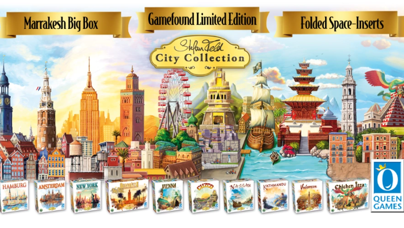 Every so often, Queen Games offers Stefan Feld’s City Collection. Feld is one of the most respected board game designers, and his City Collection is a treasure. Yes. Feld is one of those designers who adheres to point salad–earning points through multiple ways–but none of the cities in this series feel the same, and Queen Games does an amazing job with their production. Feld’s City Collection looks great on the shelf. These ten games–yes, 10 whole games–look like prestige books on a shelf. As of the writing of this post, we know little about the project besides Marrakesh getting a new expansion or three. And the games use a new “Folded Space” storage system. I can’t wait to see that. If you’re interested in the Stefan Feld City Collection, check out its page on GameFound.