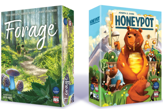 I love the Flatout Games creative team, Molly Johnson, Robert Melvin, and Shawn Stankewich, behind the Point Salad series of games. They’ve had a few other hits like Propolis. Each one of their games is a joy. Well, they’re back at it with Forage, and the designer of Fantastic Factories, Joseph Z. Chen, joins the party with his latest offering, Honeypot. Yes! AEG/Flatout Games are known for their combo releases on KickStarter and the pairing of Forage and Honeypot looks to be another great.