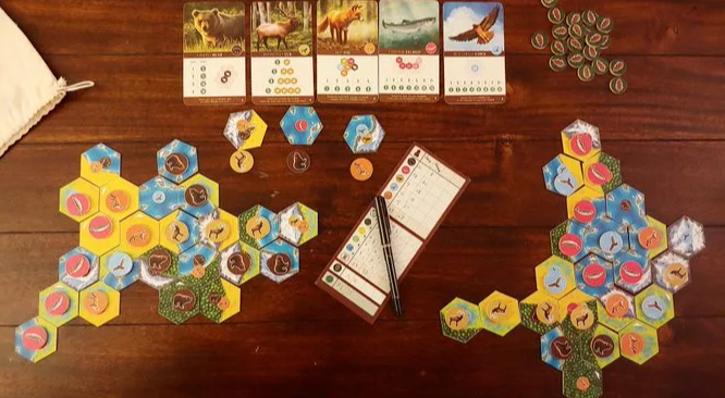 I have been meaning to play Cascadia ever since it was first released in 2021. I never picked up a copy of Cascadia because I already owned Overboss, which has a similar pick-up a tile and token combo. But that’s where the similarities of the two games end. Cascadia offers varied but balanced play in every game. I didn’t catch all the ways one can score during the original rules explanation (I didn’t know that each collection of land types scored, and it wasn’t just the player who had the most of the largest type of each land), but my brain wouldn’t let me place a tile without a match. I ended up scoring way more points than I thought I would. And matching animals to the pattern they wanted made thematic sense. I was impressed.