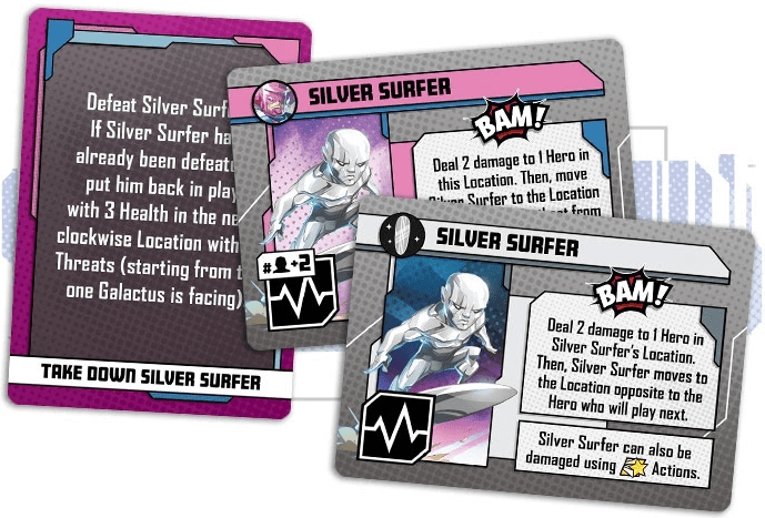 I like how Marvel United: Fantastic Four – The Coming of Galactus includes a Silver Surfer Herald Threat Card, so you can use Silver Surfer as one of Galactus’s heralds. That’s awesome and a great touch. Galactus adds a heap of Civilians and Thugs to the board each one of his turns; he adds one or the other to each Location he’s not facing. This applies plenty of pressure. At first, I wondered why the Heroes were given six action tokens to split among themselves. Yeah, you’ll need every last one to defeat Galactus. The few Master Plan cards that don’t add copious tokens shake up the game by bringing back defeated threats of a certain type or adding brand new Heralds. Yay!