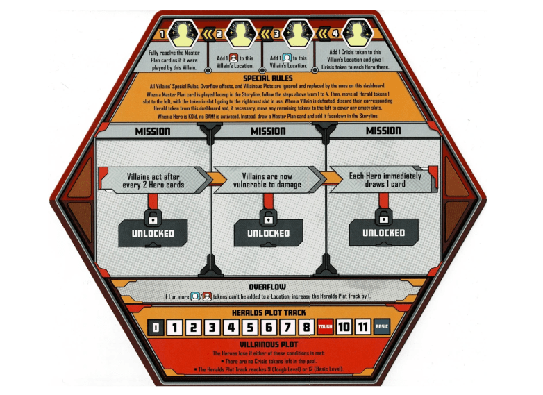 After the heroes complete the first mission, the villain panics and will act (play a card) every two hero cards instead of every three hero cards. After the heroes complete the second mission, the villain becomes vulnerable to damage. The heroes can complete the third mission, but it isn’t necessary. If the heroes do complete the third mission, each hero immediately draws 1 card, increasing each player’s hand size by one.