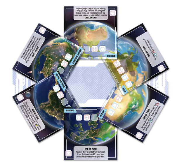 Europe allows you to draw a new hand. Simple but great. Africa’s ability to discard a card to the bottom of your deck to defeat 1 Thug and rescue 1 Civilian anywhere is one of the best ways to prevent overflow, a common issue. Asia adds multiple Thugs and/or Civilians to itself, but Asia can house a game-high six tokens. Yikes! Sometimes you need extra Tokens to accomplish goals. And Oceania may have the single most broken ability. You may KO your Hero to remove them from the game (discarding any Action tokens you have) and choose a different Hero. What? Oceania may be the only way you can keep a game with Galactus going. Oh, I’m almost out of cards. KO. New hero. Talk about an insane power.