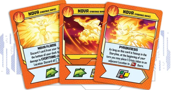 Nova (Frankie Raye), one of Galactus’s Heralds, can also be played as a hero. She offers a bunch of move, a large amount of damage, and little Heroics. Her special abilities can be great in certain situations. “Nova Flame” deals one damage to Everything at her Location, while also discarding (not rescuing) Civilians. This is a good way to clear a Location. But her starting card “Pyrokinesis” begs to be played first. As long as “Pyrokinesis” is faceup in the Storyline, at the beginning of your turn, you may place 1 Crisis token in an adjacent Location to deal an extra damage there. If the villain(s) you’re facing don’t use Crisis tokens, no problem. If they do use Crisis tokens, you could be in trouble.