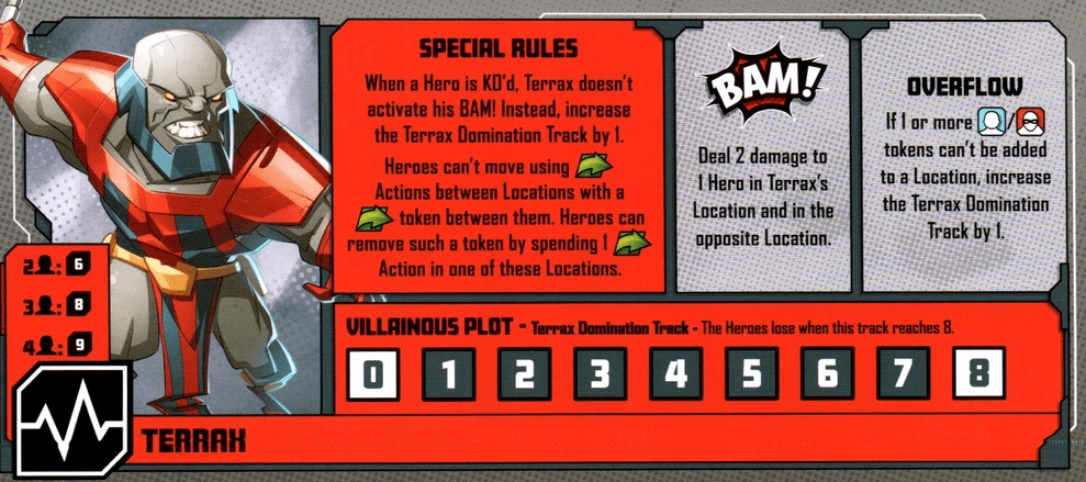 The villain(s) play first. Draw the top card of their master plan deck. The villain moves the number of spaces indicated. Resolve any BAM! Effects and these effects will be printed on a space within the villain’s dashboard. Then, place the civilian/thug tokens (if any) indicated at the bottom of the card. If a player has taken the role of the villain, they get a hand of cards and can choose which card they play. The heroes get their turn after all the villain’s effects are resolved.