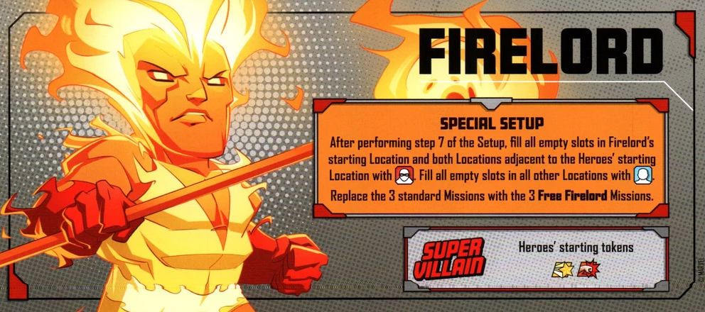 Players place their miniatures on one of the six location cards, usually the centralmost location for each player (easy access). Then, they place the villain on the location card opposing the heroes.