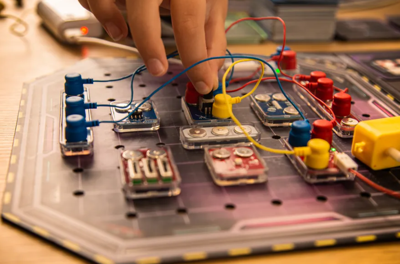 To make repairs, players must collect electronic component cards that represent real electronic parts such as a LED, buzzer, switch, motor, sensors etc. These parts are then used to build actual working circuits using modular, magnetic Labbox blocks.