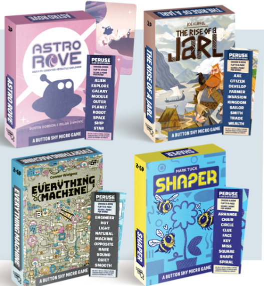Button Shy releases their first collection (for 2026). That’s right. Button Shy Micro Games has released their Spring 2026 collection. A few reprints (Rove: Results-Oriented Versatile Explorer, Aqua Rove, and a secret reprint) join newcomers Astro Rove, The Rise of a Jarl, Everything Machine, and Shaper. We won’t discuss the reprints too much, they’re previous versions of one of the new games (Astro Rove), anyway, so let’s get to the new stuff. Bring on Astro Rove.