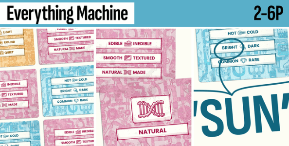 Oh, my! Everything Machine is one of those games I would like to play, but would stink at playing. Speed could make Everything Machine trickier than most games of this ilk. In the example above, “natural” and “bright” are the two clues on the back of the card, so in this example, the clue giver (the Machine) says, “sun,” because the sun is natural and bright. It fits both criteria. I don’t know how I feel about blurting out answers to beat opposing players, but I do like quick and easy word games.
