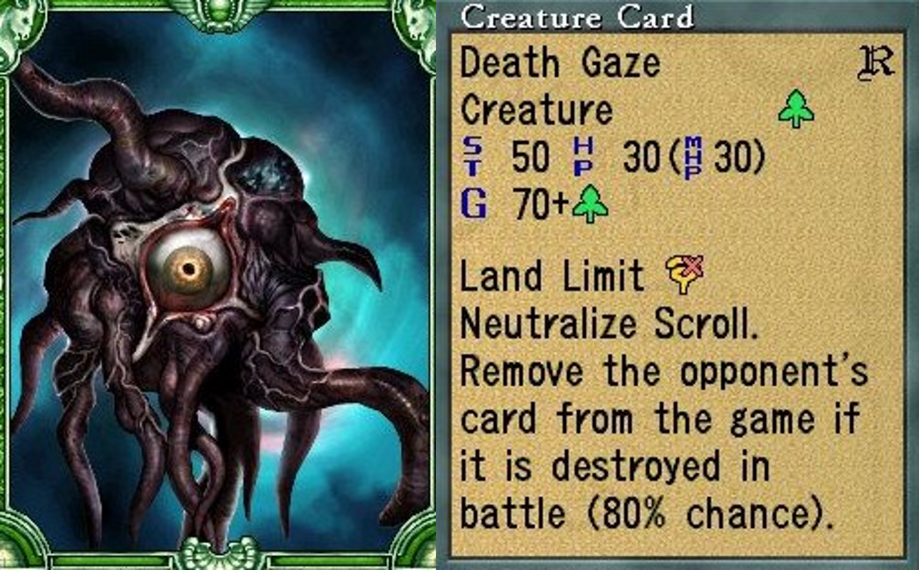 Below, we have a “Death Gaze.” It’s a rare earth creature. It has ST: 50, HP: 30, MHP: 30, and G: 70+ you must own at least one more earth land to place “Death Gaze.” The printed “Land Limit” shows that “Death Gaze” cannot be placed on a wind land. The “Neutralize Scroll” effect means that it’s impervious to scroll attacks.