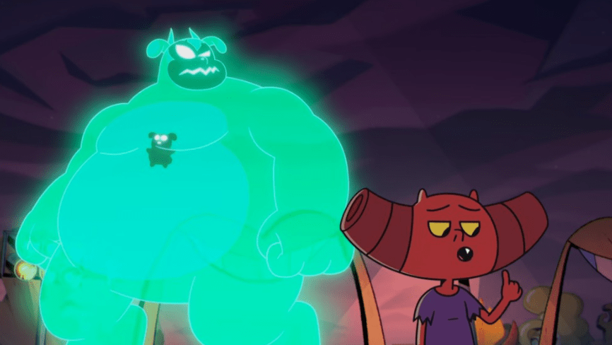 Barney’s story in “Going Up” centers on rescuing Pugsley, so we get little trans representation in this episode. Or do we? We’ll discuss how Courtney’s story plays into Dead End: Paranormal Park’s greater trans narrative in a minute, but first, let’s discuss some quick Barney points. That almost sounds like brownie points. Tee hee! Asmodeus (Barney’s wrestling sparring partner) in any episode offers great acceptance for Barney’s identity. Those two have a wonderful bromance. You love to see it.