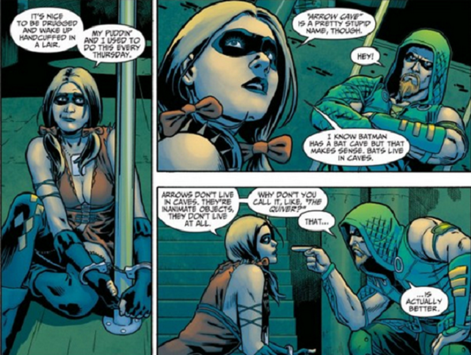Now he doesn’t call his hideout the “Arrow Cave” often, but there’s a really great scene between Harley Quinn and Green Arrow about the “Arrow Cave.”