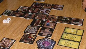 Players explore the house, laying down a new tile adjacent to a door space in the room they currently occupy. Most of the rooms have icons on them, and these icons indicate whether you pick up an item, trigger an event, or get the heeby-jeebies and draw an omen card.