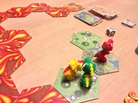 Flip over the terrain tile closest to the volcano that isn’t already showing its lava side; the lava spread to the next space. If any dinos are on that space, they receive one wound token worth one negative point. If any dinos are on the spaces before that space, whenever they enter the new space, they receive one wound token. Finally, the player with the egg takes one wound token and they hand the egg to the player to their left. About the only thing good that happens with lava is that they count as any terrain. All you have to do to enter a lava space is discard any card from your hand–this makes for a great catch-up mechanism.