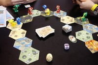 The first one lets you steal a card from another player, the second allows you to knock over another player’s dino who’s on the same space as one of your dinos (they’ll have to use a terrain card of the same type tile they’re on to stand upright), and the third lets you steal the egg from the player with the egg. Once a player’s done with their turn, they roll the event die.