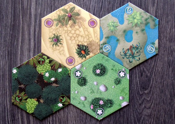The tiles, besides the volcano tile, are double-sided. Each tile has a lava side and a terrain side. There are four types of terrain: swamps, plains, deserts, and forests. Here’s a sample of the four terrains.