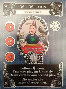 When you have a good, negative score on your character, you can off them with an untimely death card. Now you get two cards that you can play on your turn, but you can’t play an untimely death card as your second card, otherwise you’d just play a negative modifier for your first card, and then kill your character with the very next card. That wouldn’t be very sporting. It might make you feel good, but feeling good goes against the tenor of Gloom.