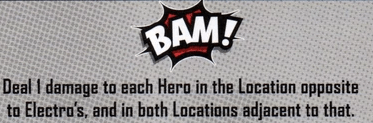 BAM!: Deal 1 damage to each Hero in the Location opposite to Electro’s, and in both Locations adjacent to that.
