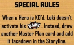 Special Rules: When a Hero is KO’d, Loki doesn’t activate his BAM!. Instead, draw another Master Plan card and add it facedown in the Storyline