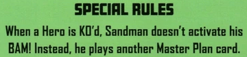 Special Rules: When a Hero is KO’d, Sandman doesn’t activate his BAM!. Instead, he plays another Master Plan card.