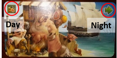 On a turn, one player is designated as “captain,” and the captain rolls two normal D6 dice (six-sided dice that number 1 through 6). After they roll, the captain arranges the dice in an area on the board labeled “day” and “night.” Each player simultaneously selects a card from their hand and places them face down in front of them. Your “day” action is on your card’s left, while your “night” action is on the right. You have to do everything you can do on your card.