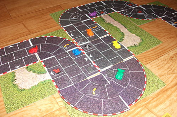Players get handed a certain number of track tiles (determined by how many players are in the game), and on each turn, they have three actions at their disposal. Five things constitute an action: moving one space (each tile has smaller movement squares printed on them), drawing an item, using an offensive item (more on this later), discarding an item (either offensive or defensive) so you can lay down more track ahead of you, and moving your cart from its side to right-side up because some yahoo oil slicked you.