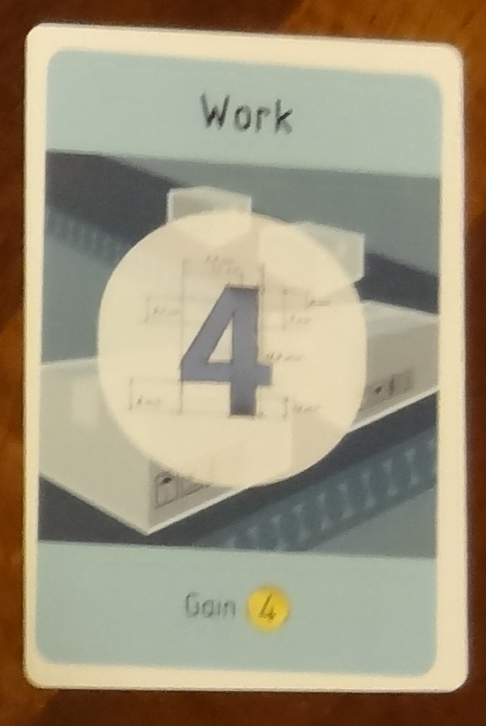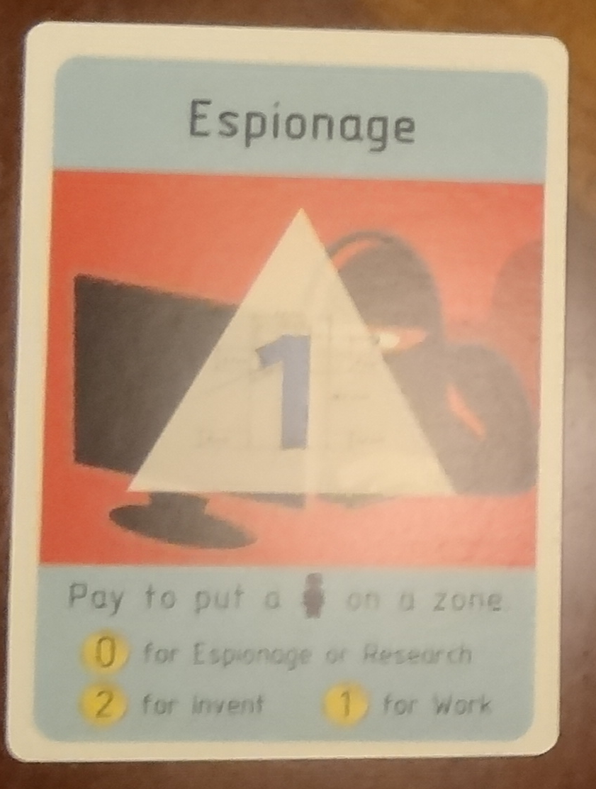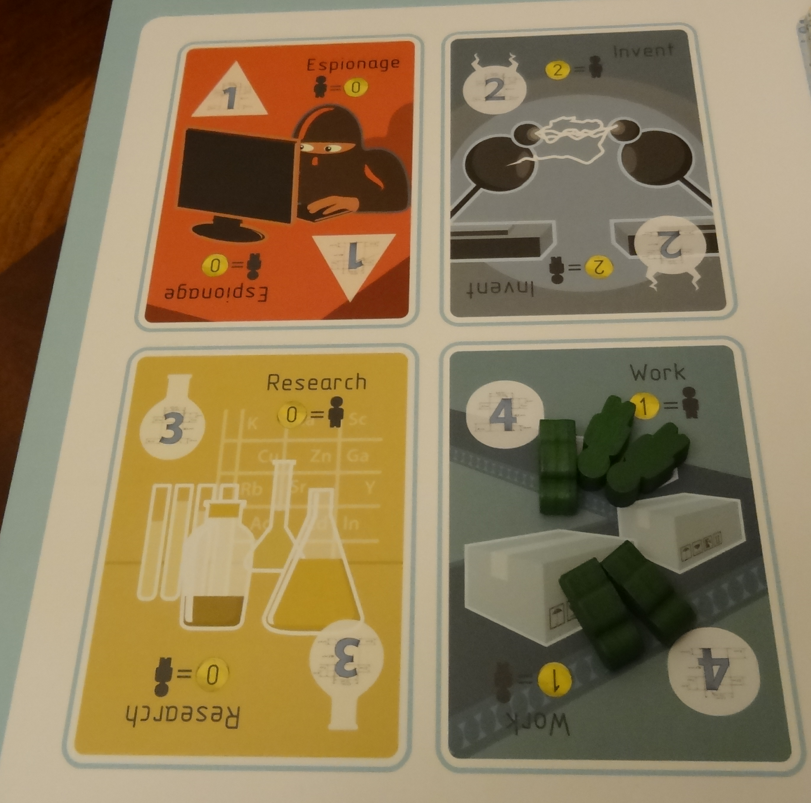 The four actions you can take on a turn are Work, Research, Invent, and Espionage.