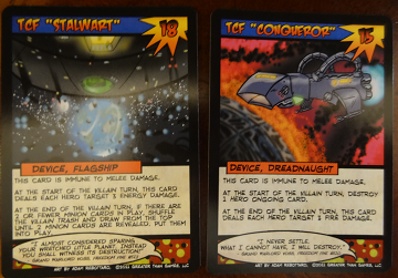 Most Fiendish Villain Target Card: TCF “Stalwart” (18 HP): This card is immune to melee damage. At the start of the villain turn, this card deals each hero target 3 energy damage. At the end of the villain turn, if there are 2 or fewer minion cards in play, shuffle the villain trash and draw from the top until 2 minion cards are revealed. Put them into play.