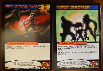 Innate Power (Initial Side): Reduce damage to Grand Warlord Voss by 2 for each minion in play. At the start of the villain turn, if 10 or more minions are in play, the planet has been overrun by the Thorathian army. Grand Warlord Voss has conquered the Earth. Game over.