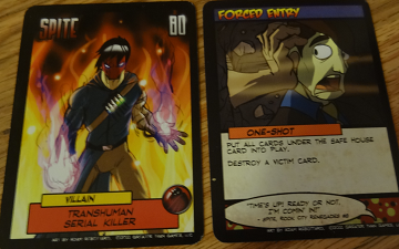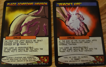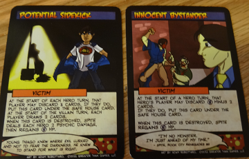 How to Defeat Spite: You don’t want Spite to get all of his drug cards in play. Usually, you won’t be able to stop this from happening, but the Visionary’s “Suggestion” and “Brain Burn” could hold off the tide as they place cards from the villain’s trash on the top of the villain deck. Otherwise, you’re stuck with dealing Spite copious amounts of damage so his healing abilities don’t gain traction. For the most part, I’d avoid saving Victim cards. Sure, if you let Spite discard Victim cards, he regains HP, but mitigating this heal mechanic by saving Victim cards doesn’t typically outweigh the cost of saving Victims. Of course this is a case by case basis. If you’re playing with a forgiving environment deck, you may want to save Victims.