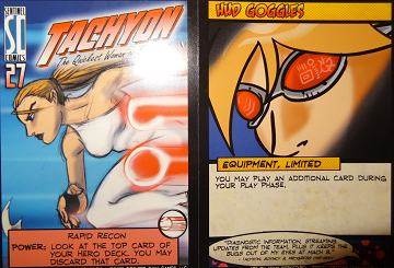 Deck Weakness: You have to build up to her large attacks because her smaller attacks don’t do much of anything, especially if the targets in question have armor—and most do. If she can’t draw cards, Tachyon’s in big trouble. She doesn’t have a lot of defense and no healing factors, so she can deal out a barrage of damage, but she can’t take one. Then you have some game mechanics that make heroes shuffle their discard pile into their trash, and this mechanic kills Tachyon’s best attacks. It’s like starting the game over.