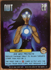 Nuit (28 HP): (Active Side) Reduce damage dealt to villain targets other than Nuit by 1. The first time a (bullseye symbol) card is put into the villain trash each turn, Nuit regains 2 HP.