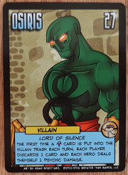Osiris (27 HP): (Active Side) The first time an (ankh symbol) card is put into the villain trash each turn, each player discards 1 card and each hero deals themselves 1 psychic damage.