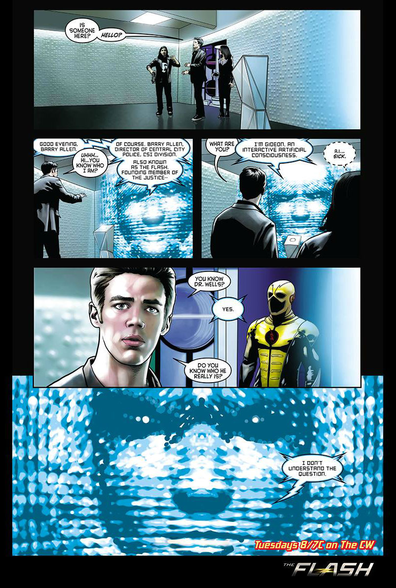 The comic based on the TV series The Flash added the line “Founding member of the Justice” before Barry cut off the Gideon AI.