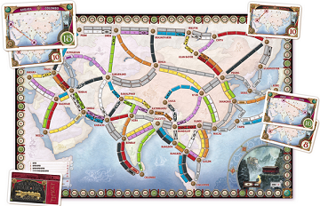Each team of two players keeps their train cards secret from each other, but they share the destination tickets, displaying them on a card tray. Game play doesn’t change as much as you would think by adding the team element, but some poor communication between teammates can lead to disastrous results.